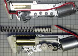 写真のスリットの入った加速シリンダーはG18C・USP・M9A1・HK45用で、M93RとハイキャパEではフルシリンダーが採用されている。シリンダー内径は約20mmと従来の電動ガンより細く、スプリングも外径約10mm・線径約1mmの細い物が使われている。軸受けやギアの軸サイズも、従来の電動ガンより細い専用品だ。